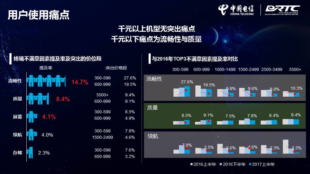 从全网通终端消费者调研看,千元以上机型已经没有突出的消费痛点,备受关注的流畅性顽疾正逐步解决,满意度、净推荐值均持续走高。但,千元以下的痛点则比较突出,流畅性与质量仍是痛点。