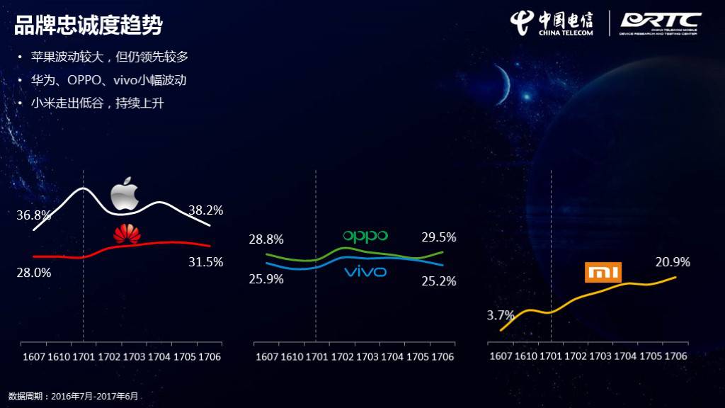 在品牌忠诚度方面,小米在过去的一年呈现单边上扬走势,2017年6月已经达到20.6%(排名第5,接近TOP品牌均值,并且用户换机频度也高于均值),这个成绩相当不错。