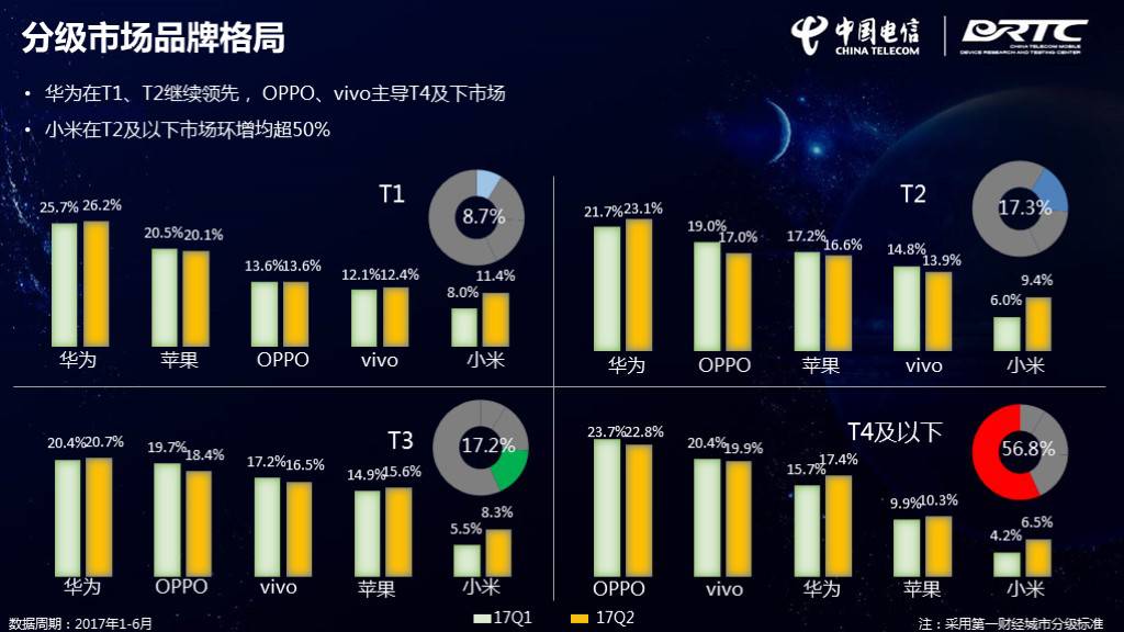 2017年,华为在T1-T3市场份额均超过20%+,处于第一位,在T1、T2市场领先优势加大。华为在高线市场的引领,个人认为更多还是品牌与产品力不断提升的结果。