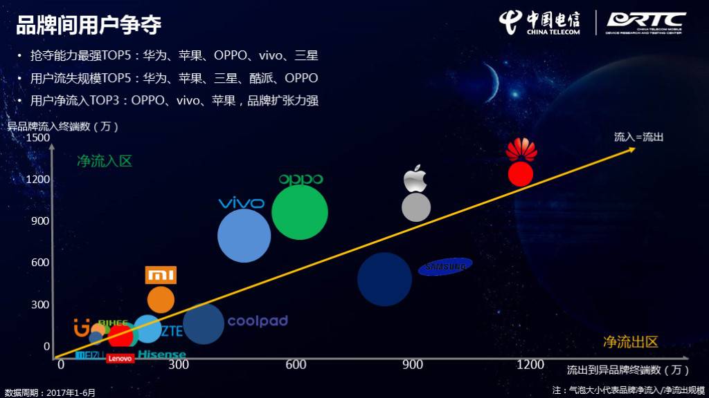 华为在抢夺异品牌量与用户流失规模两个指标上均高居各品牌第一,而在净流入方面华为表现不好,低于OPPO、vivo、苹果等主要竞争对手。