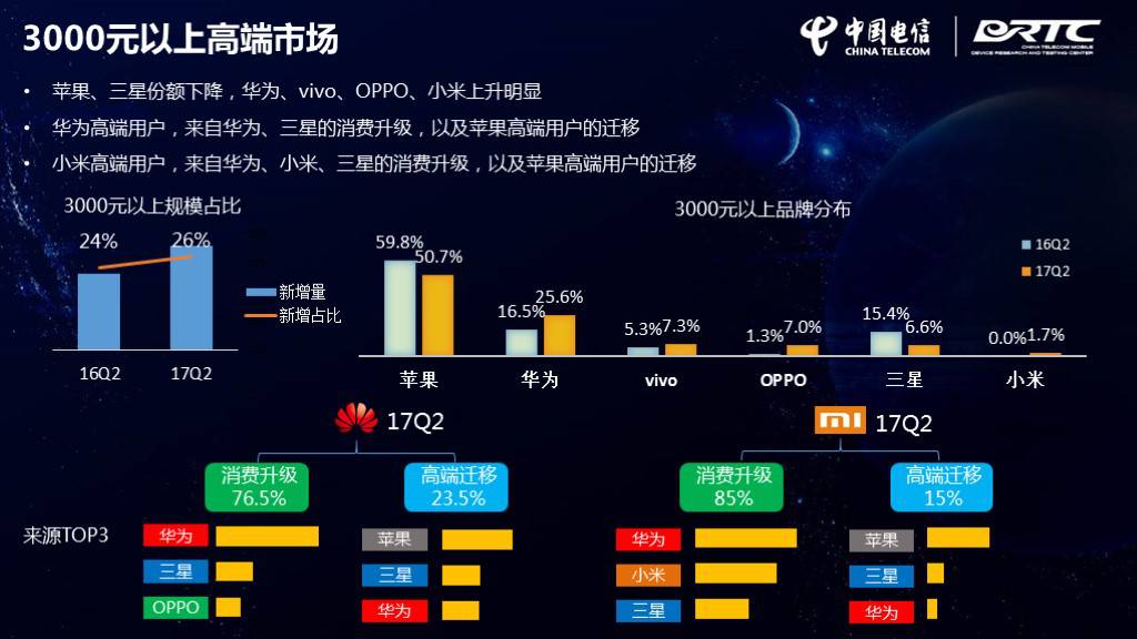 2017年Q2,华为3000+产品用户的来源中,可以发现,76.5%来自于消费升级(上一部手机在3000元以下),23.5%用户来自高端迁移(3000+用户的换机)。在消费升级的76.5%用户中,25.9%来自华为、9.2%来自三星、6.2%来自OPPO;在23.5%的高端迁移用户中有10.7%来自苹果、5.8%来自三星、5.6%来自华为。