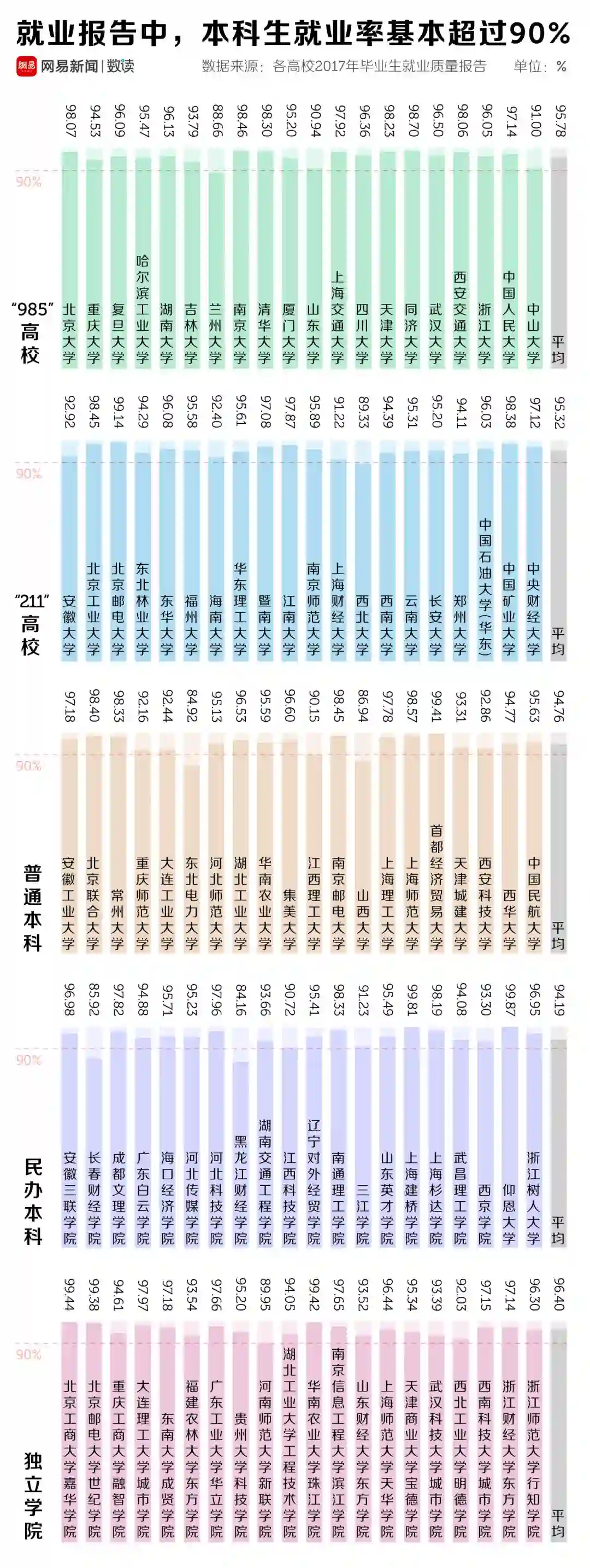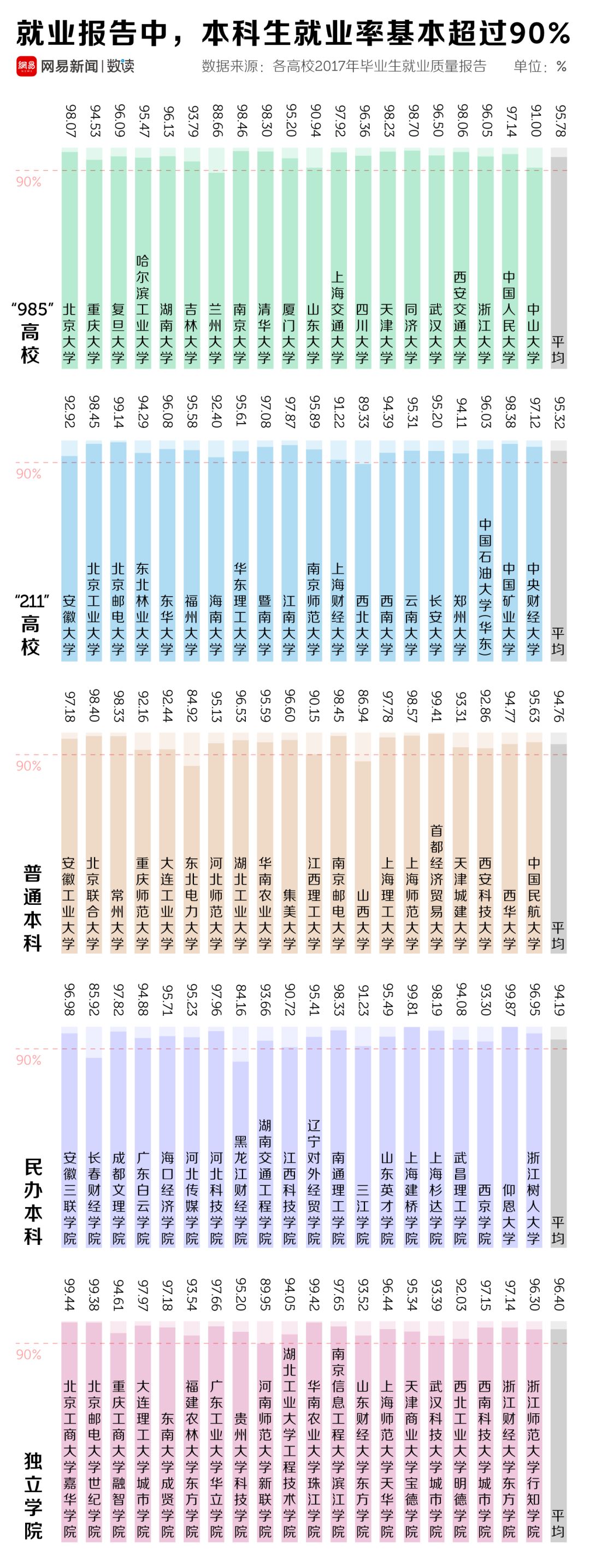 按照“985”高校、“211”高校、普通本科、民办本科和独立学院这五类,我们选取了100所高校,来统计高校公布的2017年毕业生就业率。