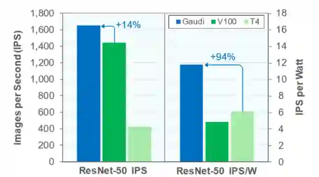 在性能方面,芯片热设计功耗为140W,在ResNet-50上每秒可处理1650张图像,比Nvidia的Tesla V100高出14%,功耗仅为后者的一半。每秒每瓦可处理的图像数量提升了两倍以上。