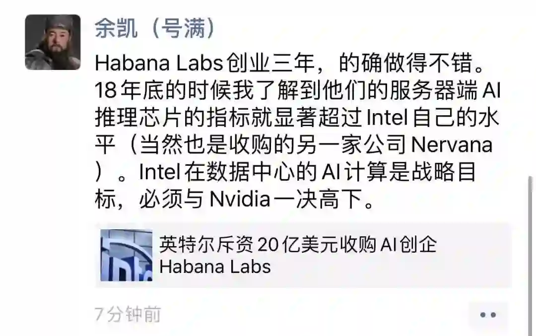 地平线创始人兼CEO余凯博士对Habana Labs表示认可,他认为:Intel在数据中心的AI计算是战略目标,必须与Nvidia一决高下。