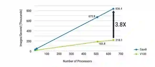 随着芯片数量的增加,二者的差异变得更大。在MLPerf v0.5数据集上,640块Gaudi芯片可实现每秒8.45亿图像的吞吐量,而80台DGX-1的基于V100的系统性能为每秒21.83万图像。512芯片的Gaudi系统的相对效率为80%,而V100系统的相对效率不到30%。