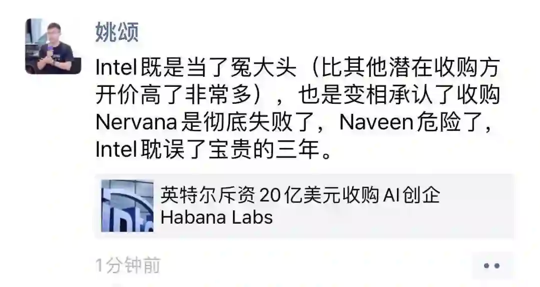 对于这一收购新闻,业内人士纷纷发表了自己的看法。赛灵思 AI 业务高级总监、原深鉴科技联合创始人姚颂评论道:Intel既是当了冤大头,也变相承认了收购Nervana是彻底失败了。