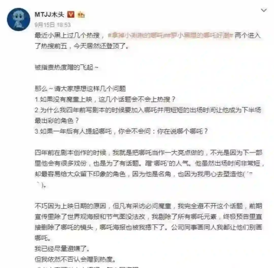 同时,由于《罗小黑》中同样出现了神话人物哪吒,这一角色被部分网友指蹭电影《哪吒》的热度,几经发酵,#罗小黑 哪吒#等相关话题登上微博热搜。导演MTJJ木头发布微博回应,“哪吒和大圣一样,是公共版权人物,自带热度,这个名字也不属于谁”,#罗小黑导演 不否认会蹭到哪吒热度#等话题又再次登上热搜,引起一波讨论。