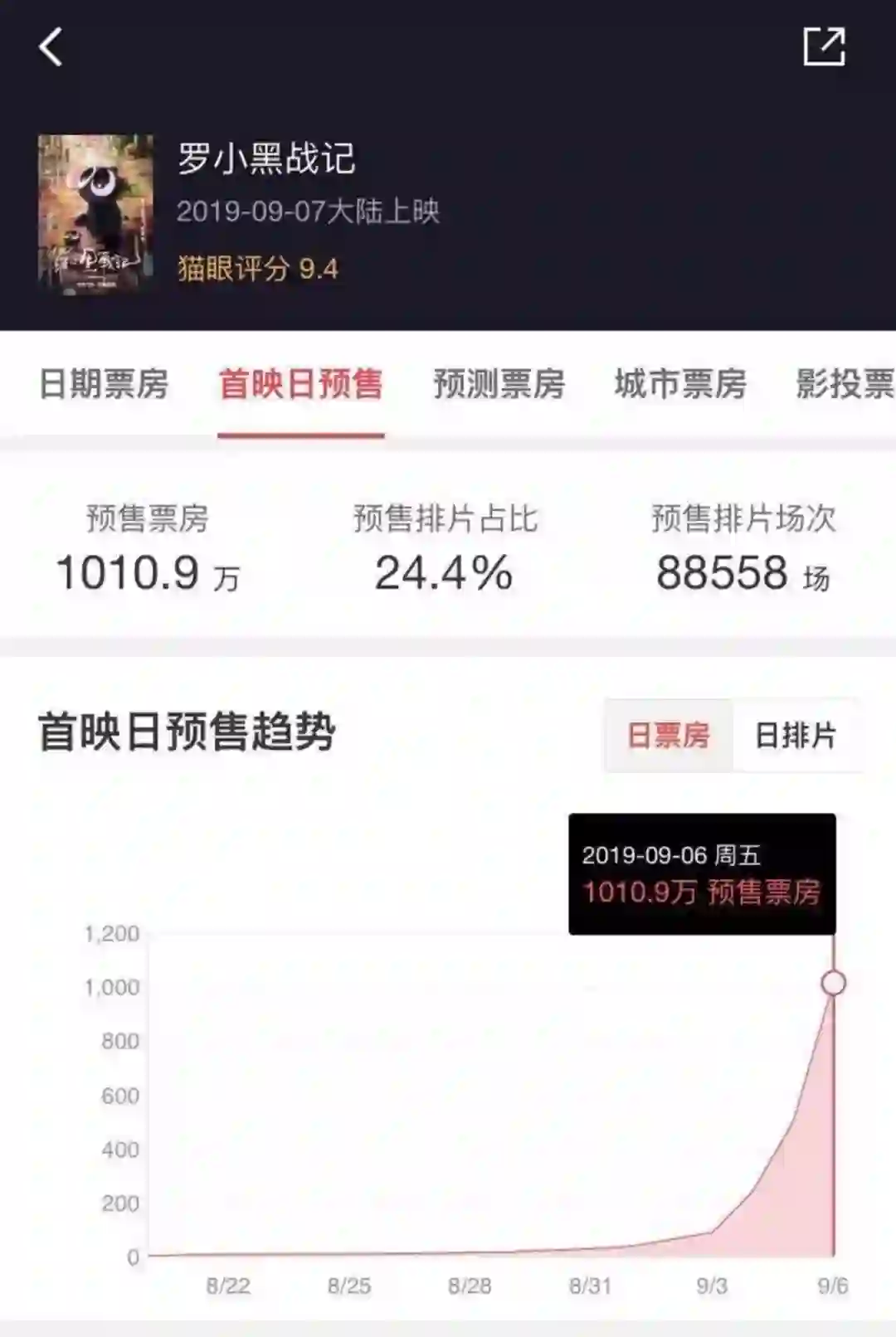 电影上映之前,从8月27日起,《罗小黑》陆续展开了900多场点映(包括520场零点场),超前点映主要锁定粉丝受众与KOL、垂直国漫爱好者等,这个开局是国产动画电影的惯有路线,以粉丝圈层发酵口碑最终撬动大众市场。而《罗小黑》也成功了,点映成功放大了此前动画TV的粉丝积累与IP效应,《罗小黑》迅速达成口碑认知,豆瓣开分8.8分,猫眼开分9.8分,淘票票开分9.7分,首映日预售票房超过1000万,预售排片占比达到24.4%。