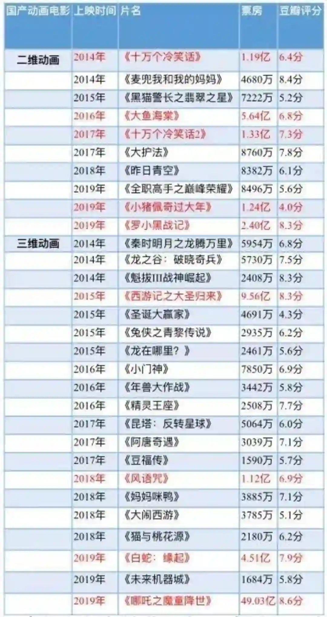 (注:表内并非全部国产动画,部分低幼系列题材、票房未过千万等电影省略)