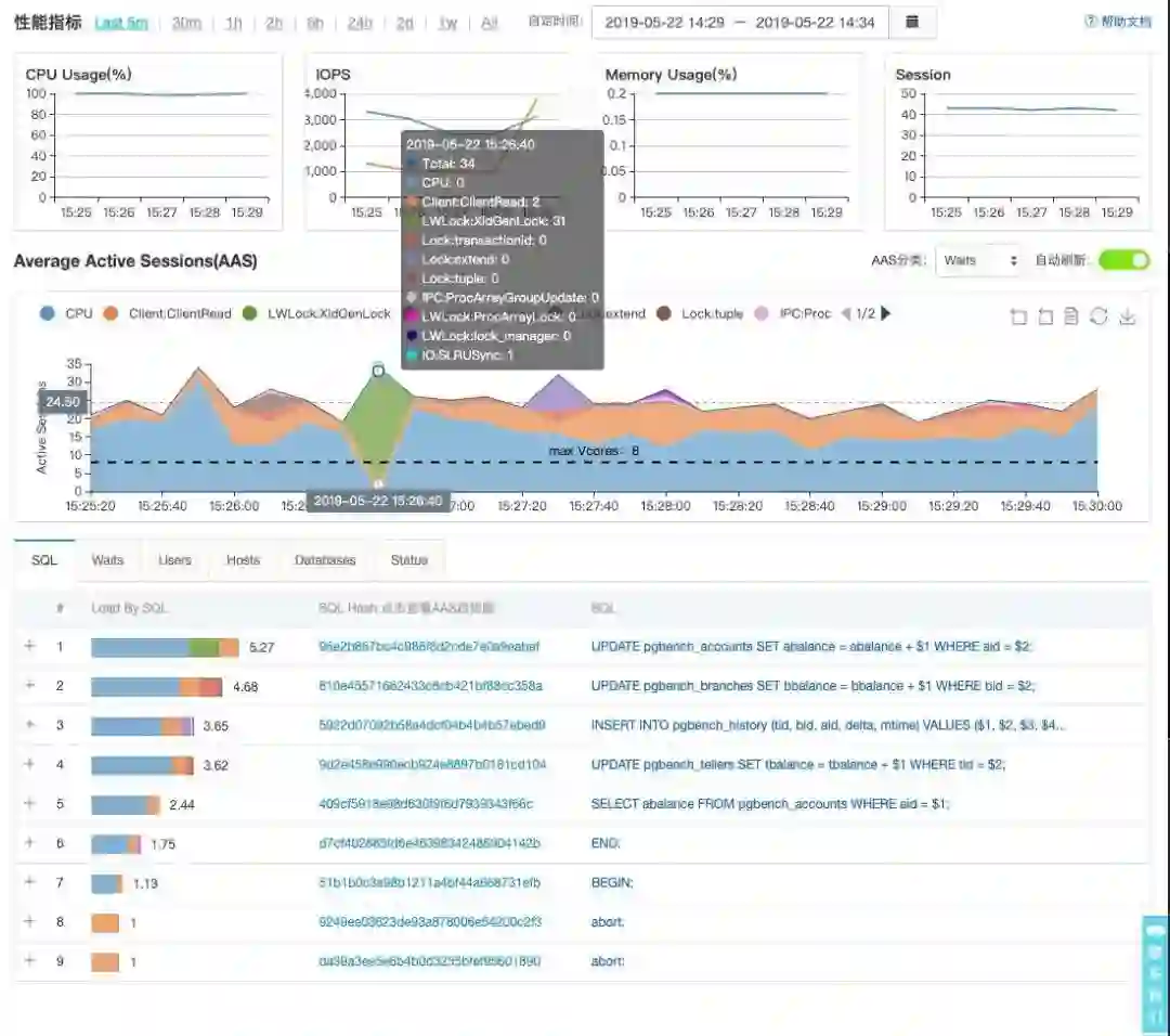 支持AAS性能洞察:在没有专业DBA的情况下,可以一键洞悉宏观、微观业务问题。帮助企业及时发现业务问题。