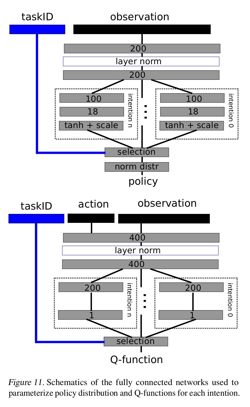 Each of these tasks (intentions in the paper) has a specific model head within the neural nets used to estimate the actor and critic functions. When executing a trajectory during training, the task (and subsequently the model head within the actor) is switched between the different available options. This switching can either be done randomly (SAC-U) or it can be learned (SAC-Q).