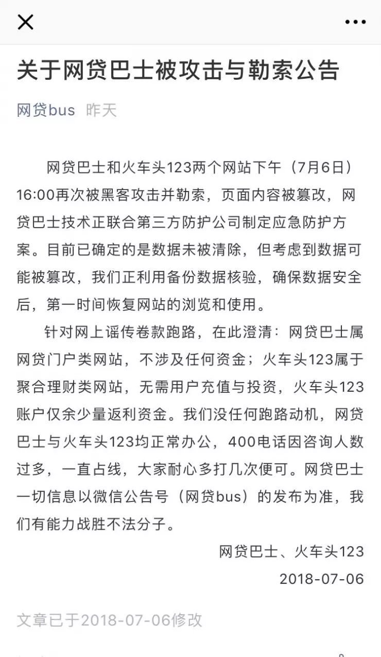 雷锋网消息,7月5日,网贷巴士在其官方微信公众号发文称网贷巴士官方网站遭黑客袭击,并且接到黑客的勒索条件。