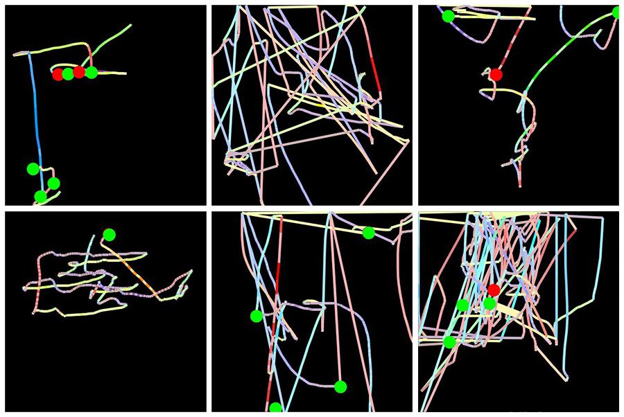 解决方案是将每个用户在每个网页上的鼠标活动转换为单个图像。在每个图像中,鼠标移动由一条线表示,其颜色编码鼠标速度,左右点击由绿色和红色圆圈表示。这种处理初始数据的方法解决了这两个问题:首先,所有图像具有相同的大小;其次,现在基于图像的深度学习模型可以与该数据一起使用。