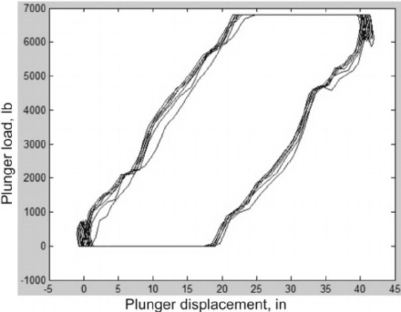 作为一个复杂系统,梁泵很容易出现故障。为了辅助诊断,在洗盘上安装了一个测量梁杆负载的测功机(dynamometer)。测功机会绘制出一个测功机泵卡(dynamometer pump card),如下图所示,显示出引擎旋转周期内的负载。