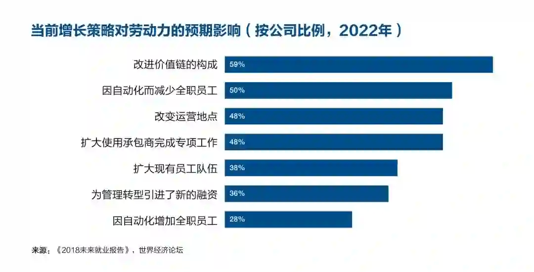 ▨ 改变就业类型:近50%的企业预计,到2022年,自动化进程将导致全职员工的数量有所减少。超过四分之一的企业预计,自动化进程会促进企业的角色创新。此外,企业将扩大与承包商的合作,让承包商完成许多专项任务。许多企业打算更灵活地雇用员工,更多采用远程办公,实现业务的去中心化。
