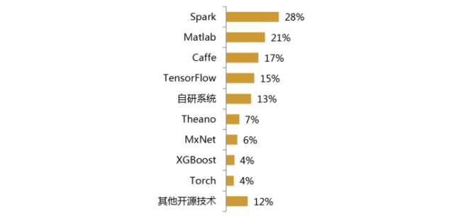 另一方面,分布式计算引擎Spark则是企业使用最多的机器学习框架。Spark专注于数据计算,具有内存计算速度快、运行时间短等特点,且生态系统丰富。随着Spark版本演进越来越成熟,它能更好地适用于数据挖掘与机器学习等需要迭代的算法中,由此吸引着越来越多的企业使用,占28%。而在深度学习框架使用方面中,Caffe、TensorFlow位居前列。