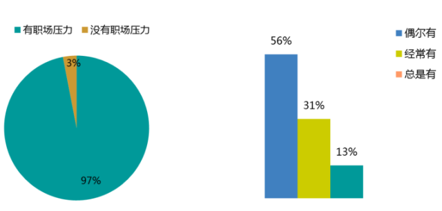 但是,与薪资同时增长的,还有极大的工作压力。97%的开发者或多或少都会感受到来自工作上的压力,其中4成以上的开发者会频繁地感受到来自职场的压力,更有10%的开发者认为自己时刻处于压力之中不得缓解。