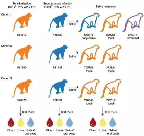 实验设计。两组动物分别通过扁桃体(橙色)和皮下(蓝色)被注射寨卡病毒。然后皮下感染的动物唾液被用来测验未接触病毒动物的扁桃体、眼睛或鼻子。最后,测试所有动物血液、尿液和唾液中的寨卡病毒RNA。