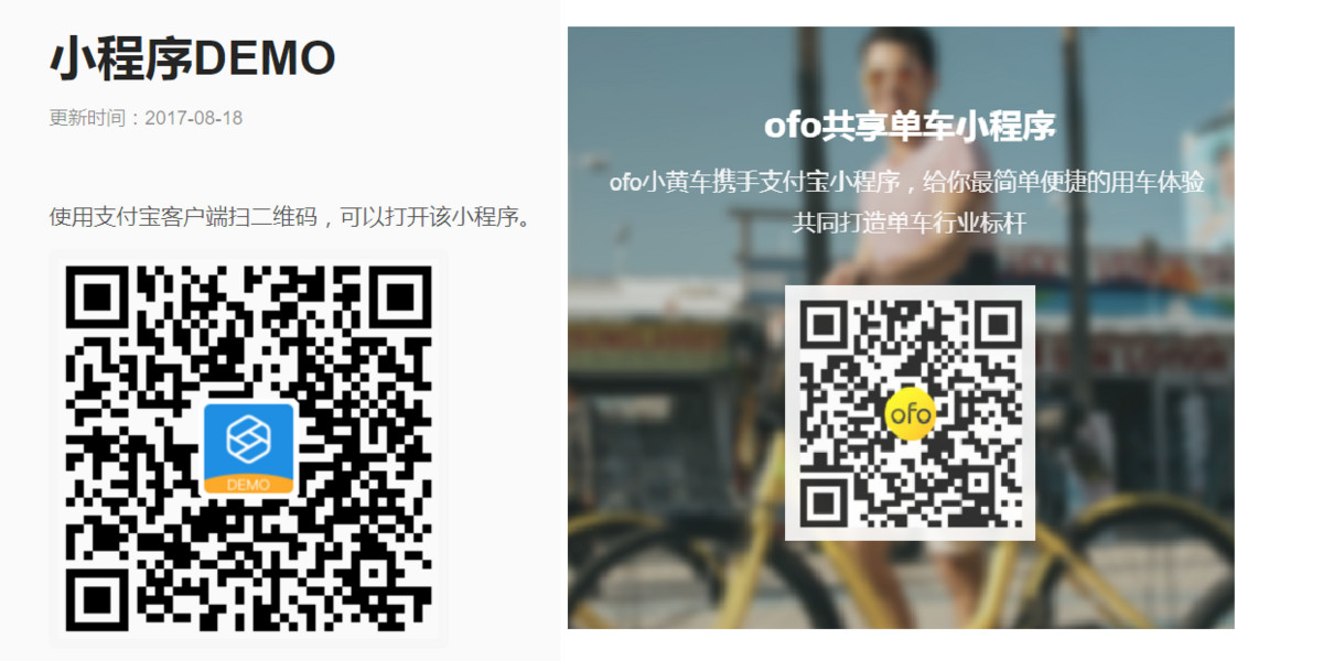 用户可以通过扫码进入支付宝小程序,目前已经进驻小程序的有ofo和街电等企业,从页面上,基本跟微信小程序无异。