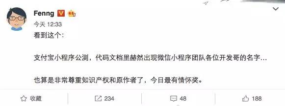 不过,在支付宝小程序公测的今天,却发生了一件尴尬的事。有人在支付宝小程序代码文档里发现了微信小程序开发团队的名字,因此网传支付宝小程序的代码“抄袭”微信小程序。知名大 V 冯大辉发了一条微博表示:
