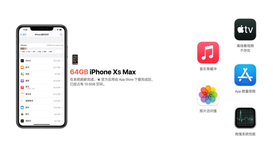 使用这款手机的两年来,64G 的容量逐渐成为阿喀琉斯之踵。首先,系统和 app 的体积越来越大。其实根本用不着说像「微信」这样的 app 空间占用大户,系统升级带来的空间占用已经相当可观。近年来 iOS 本身体积的不断增长对容量较小的手机来说是致命的;除此之外,随着 iOS 机型的扩展,app 中许多对当前设备无用的资源也侵蚀着 iPhone 的存储空间。iOS 相对封闭的特性又使得这些占据空间的「垃圾文件」难以废除。当年 64G iPhone 6 还可装 100 多个 app,如今在 iOS 14 下,我的 64GB iPhone 在 70 个左右 app 的时候,存储空间已经达到了 50G 甚至更多。