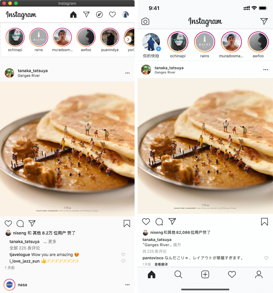 根据我的经验,如果将支持 PWA 特性的网页使用 Coherence X 封装之后的体验还不错。例如下方的 Instagram,左侧是 Coherence X 封装的应用、右侧是 iOS 版本的应用。而不支持 PWA 特性、甚至非响应式设计的网页,建议使用浏览器直接访问。