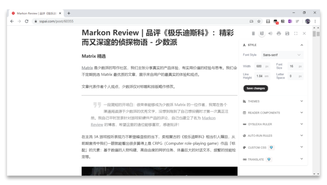 Reader Mode 最大的亮点就在于它支持对阅读模式进行相当全面的自定义设置,从字体大小、行高等常规设置,到自动进入阅读模式、自定义 CSS 等高级设置一应俱全。可以说,只要你看起来舒服的页面格式,Reader Mode 都能帮你做出来。