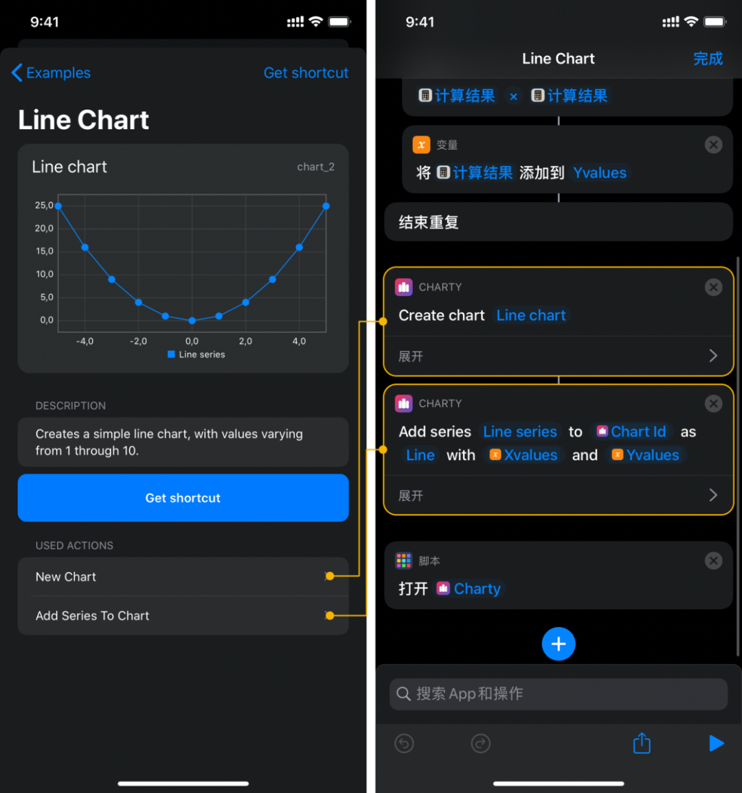 此外,Charty 还提供了一系列更为复杂的示例。例如:你可以通过快捷指令本身提供的数学计算完成函数图像的绘制;可以读取健康数据,自行定义健康应用以外的可视化方案;甚至可以读取本地 CSV 数据文件完成可视化。