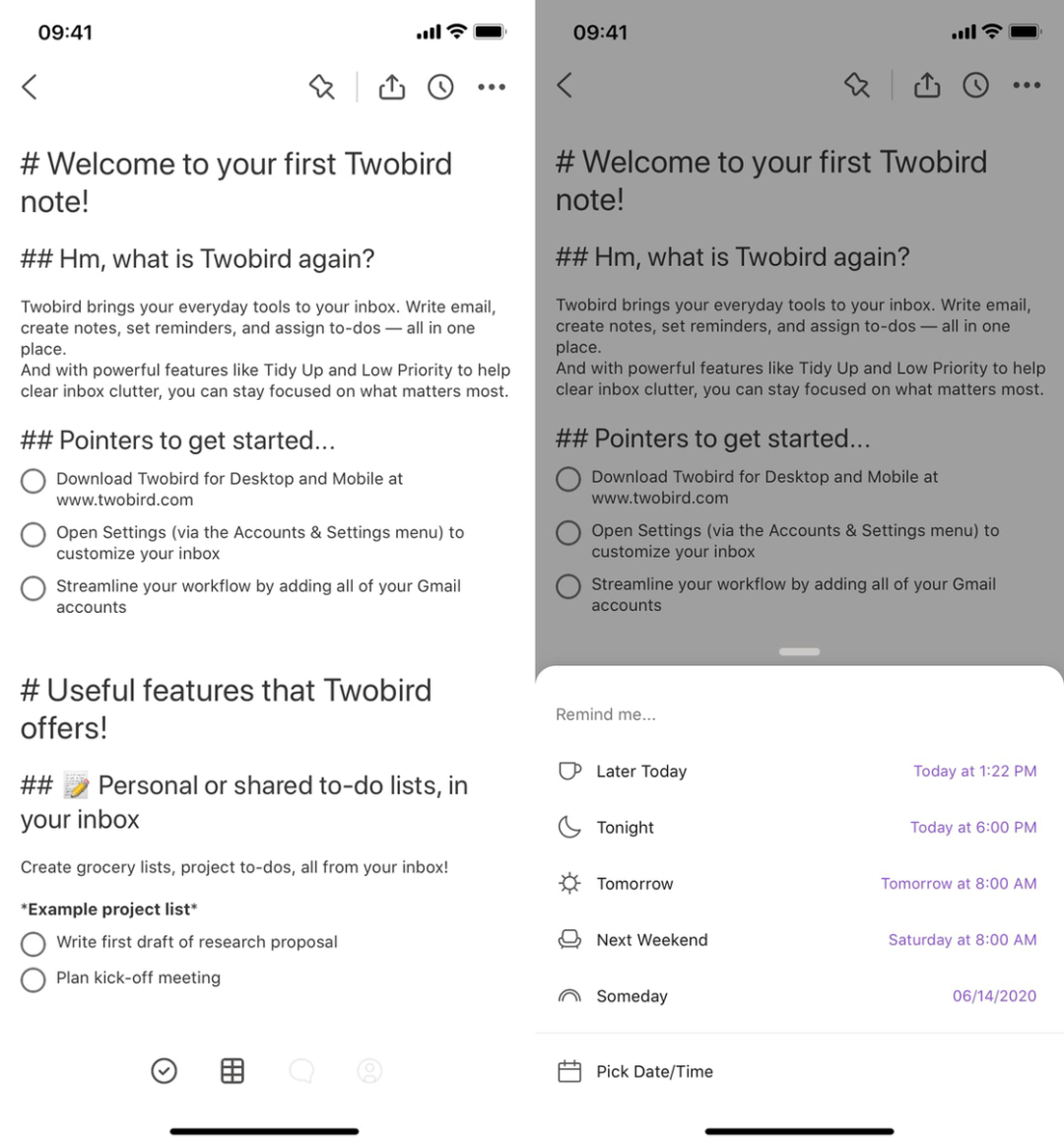 Twobird 最大的亮点就是邮件与备忘录的整合,应用支持通过简单的 Markdown 语法进行排版、创建待办清单等操作,你也可以在备忘录里添加表格。值得一提的是,Twobird 支持为当前备忘录添加提醒时间,或是将其分配给通讯录里的人,实现多人协作。