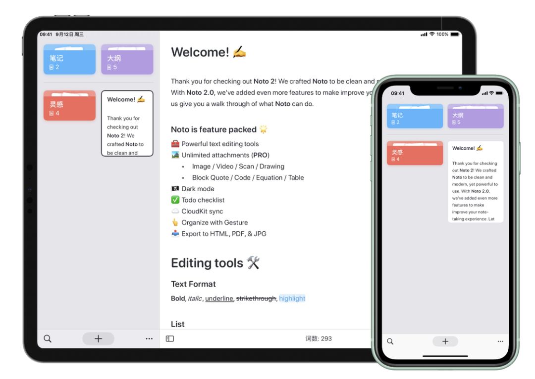 此次更新还让 Noto 在 iPadOS 上支持了鼠标操作,实际体验非常不错,基本能够实现不抬手完成所有操作。在 iPad 上,你现在也可以通过滑动来隐藏侧边栏,进入全屏编辑。此次更新最大的特点就是支持了通用购买,如果你使用的是 iOS 13.4 或 macOS 10.15.4 以上的系统,你只需要在某一平台订阅了 Noto Pro,就可以同时解锁其它平台的 Pro 版,不再需要重复订阅。