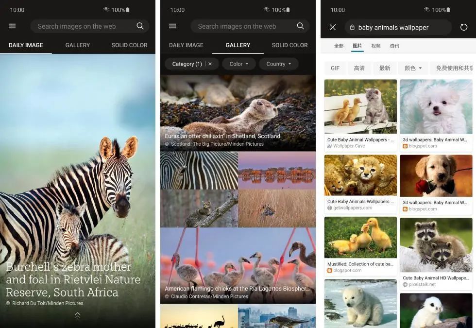 Bing Wallpapers 将图片展示分为三个标签:Daily Image 每天都会与 Bing 搜索主页同步更新图片,上下滑动切换历史图片,点击图片便会展开图片故事,点击故事又会跳到 Bing 展示相关搜索内容;Gallery 精选了 Bing 搜索主页所有历史图片以及故事介绍,可以在上方通过类别、颜色、地区筛选图片(动物分类第一个便是我派吉祥物呢);Solid Color 则顾名思义,仅仅是内置了一些纯色而已(可能会用来检测屏幕坏点吧)。