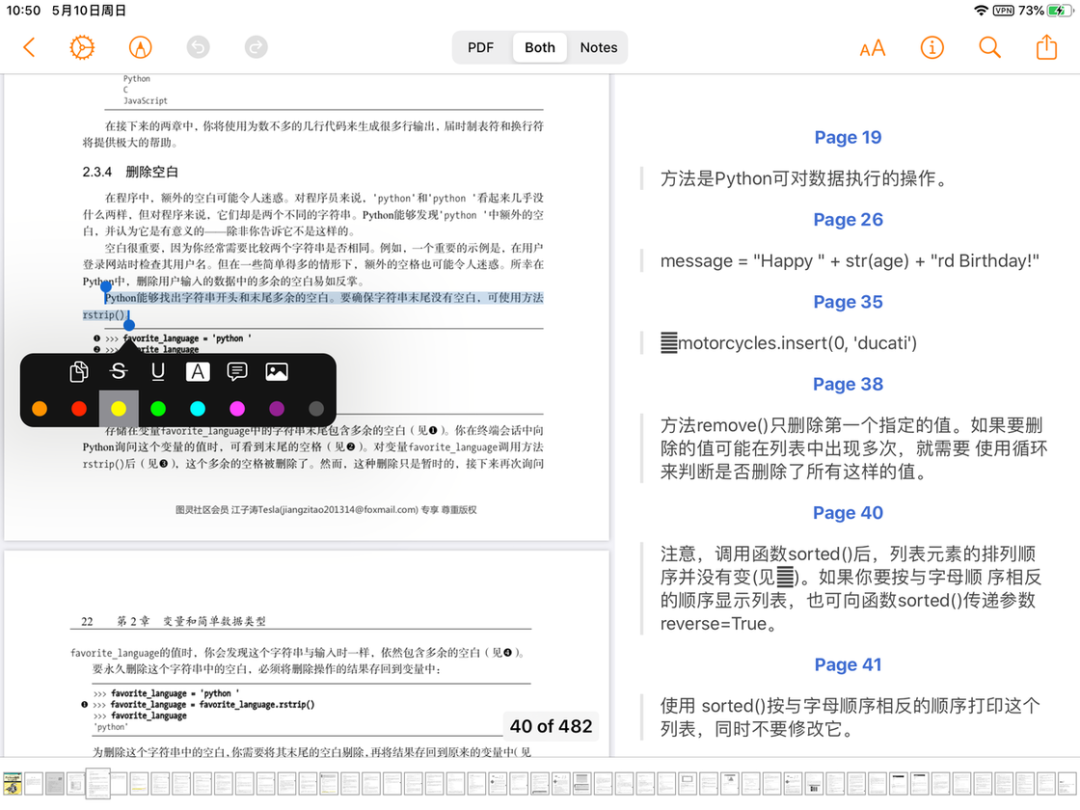 Highlights 打开 PDF 文档的速度很快,阅读时也鲜少遇到卡顿或者显示不完全的情况;其次,作为一款标注工具,用 Apple Pencil 可以选择文本,然后可以在快捷工具中对其进行标注处理,比如说划线来突出内容、加上内容注解等。Highlights 提供了三种内容展示模式,比如你可以在竖屏状态下只显示 PDF 内容,也可以在横屏状态下左边显示 PDF、右边显示相关的注释内容。
