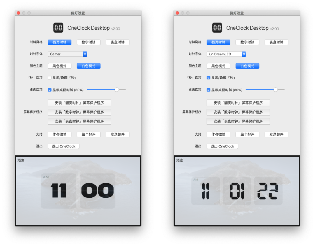 与 Fliqlo 一样,OneClock 也是一款支持 macOS 和 iOS 平台的时钟屏保工具,在近期推出的 2.0 版本中 iOS 版本增加了秒数显示以及音效开关,并对时钟样式进行了优化;macOS 版本则进行了重新设计,新增桌面时钟、屏保等,还支持了更多表盘、主题、字体等样式方面的设置选项。