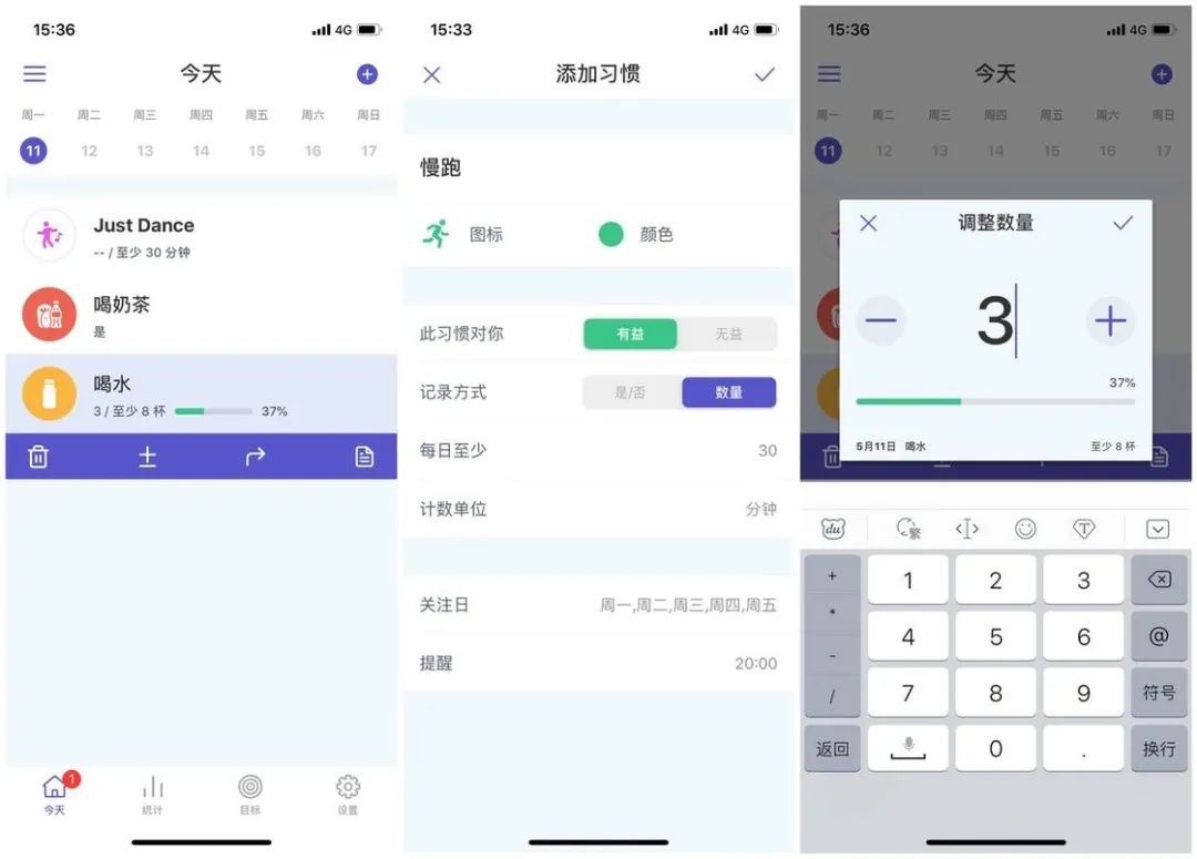 和同类应用一样,点击右上角的「+」就可以开始设置习惯目标,不过日省的习惯分为两类,一类对你有益、一类则是无益。针对于习惯的记录,你可以笼统地统计为「是/否」做了,也可以精细化地统计,例如有益的体育锻炼是否超过 30 分钟、无益的吸烟习惯是否不足 3 次等,充分满足你的个性化需求。为了满足多样化的习惯目标,应用内置了超过 300 款图标和 12 种颜色标记,可以更好地进行区分。