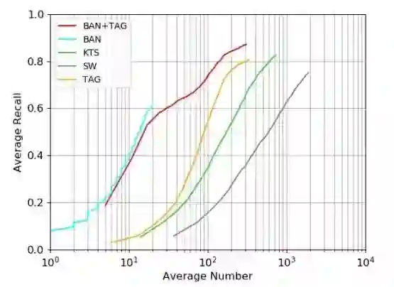 可以看到,当提议数量较小时,新提出 BAN 的平均回调指标(average recall)显著高于其它方法,但由于其选择标准,它不能生成其它方法那样多的提议。注意 TAG 和 BAN 是高度互补的,将它们的结果融合到一起可以得到明显更好的曲线。