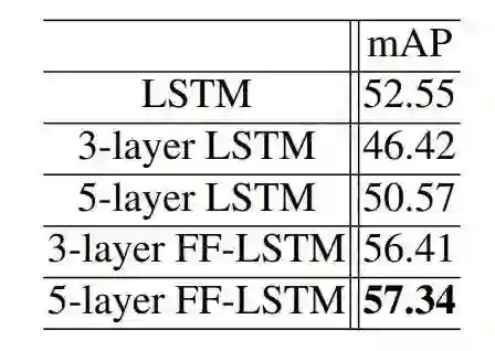 不同于之前的最佳方法(这些方法的提议生成仅取决于动作性质),BAN 使用了额外的帧级边界性质来生成提议,这能在提议数量较小时实现更高的精度。而且,不同于用于序列建模的传统 LSTM,FF-LSTM 引入了连接堆叠的 LSTM 层的快速前向连接,从而能在深度循环拓扑结构(deep recurrent topology)中助力实现稳定高效的反向传播,进而提升视频故事分类的效果。