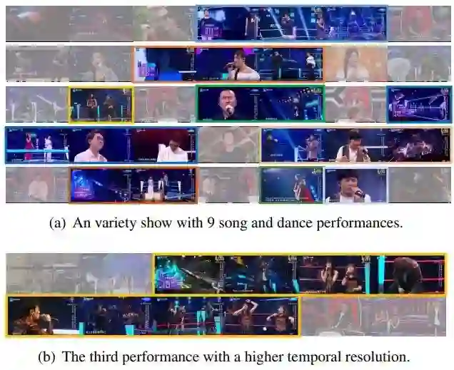 下图 1(a) 展示了 TruNet 中的一段示例视频。这段视频是一场综艺节目,其中包含 9 个歌唱和舞蹈节目。这 9 个短故事表示成了不同的颜色。图 1(b) 用更高的时间分辨率(temporal resolution)展示了第 3 个节目。