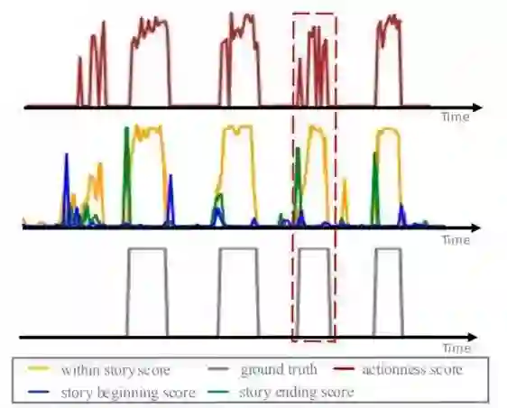 如果一个帧序列中的每一帧都属于「故事中」类别,那么便将该帧序列视为一个候选故事。再执行一个简单的扩张融合算法,将距离较小(5 帧)的相邻候选故事合并到一起。然后执行非最大抑制(Non-Maximal Suppression,NMS),减少冗余并生成最终提议。