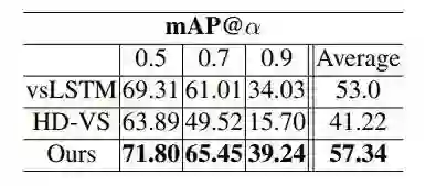 研究者还将新提出的框架与当前最佳视频摘要方法进行了比较,包括 vsLSTM [36] 和 HD-VS [33]。结果见下表 6。