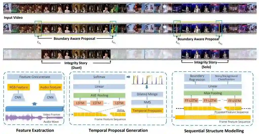 给定一段输入的长视频,先提取出基于 RGB 的 2D 卷积特征和音频特征,并将它们连接起来。在时间提议生成组件中,将这些特征输入 BAN,预测每帧的吸引力和边界性质。然后执行一个扩张融合算法(dilated merge algorithm),根据帧级的吸引力和边界性质分数生成时间提议。在序列结构建模组件中,通过 FF-LSTM 建模每个提议的序列结构,这能输入提议的分类置信度分数以及经过细化微调的边界。