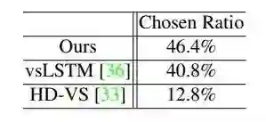 可以看到,新提出框架生成的故事摘要收到了 46.4% 的投票,高于 vsLSTM(40.8%)和 HD-VS(12.8%)。