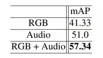 下表 3 总结了使用不同特征的控制变量研究结果。可以看到,RGB 和音频特征是高度互补的,丢弃任何一类特征都会显著影响结果表现。