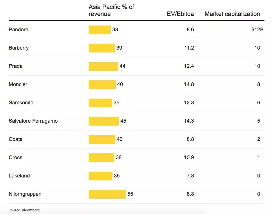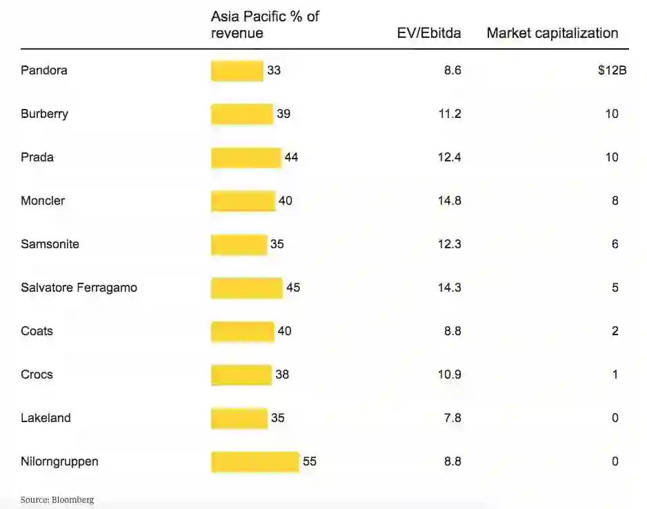 注:所列公司均属服装和奢侈品行业,来自亚太地区的营收至少占25%,市值在1亿到200亿美元