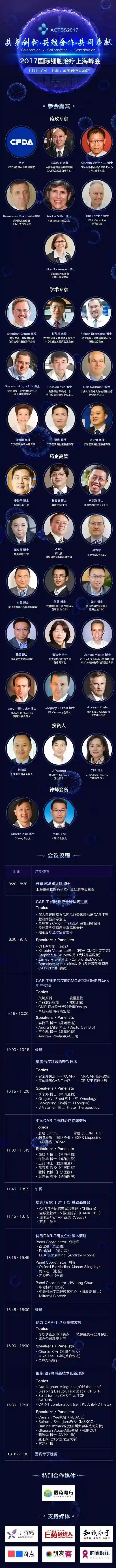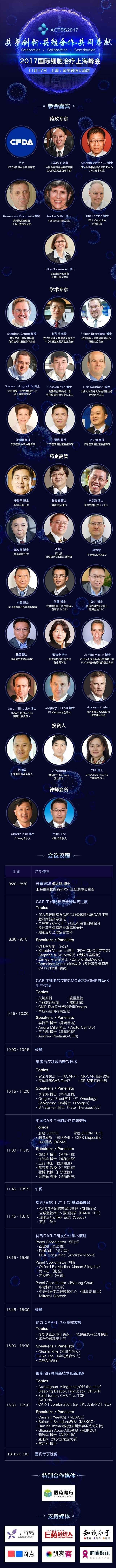 为此,上海市生物医药科技产业促进中心拟联合相关研发、监管机构在上海举办“2017国际细胞治疗上海峰会”。本次峰会邀请了30多位国际顶级的CAR-T专家和临床KOL、三大药监机构审评专家、知名企业C-level高管、顶级律所专利律师,将从技术、生产、监管、知识产权、企业融资发展等各个角度为大家带来精彩主题分享。