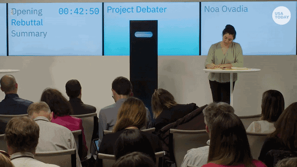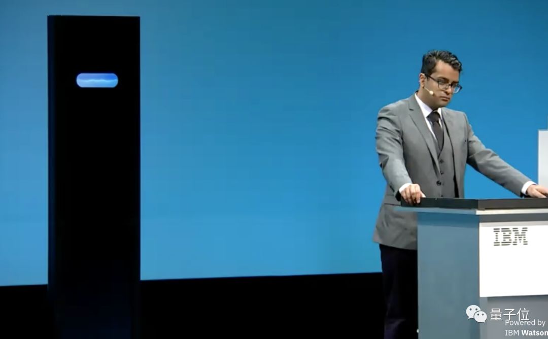 人机大战的一方是IBM的的AI,Project Debater,那块黑色面板就是它在人间的载体。去年6月,它击败了2016以色列全国辩论冠军Noa Ovadia,创下了AI在辩论方面击败人类的历史记录。