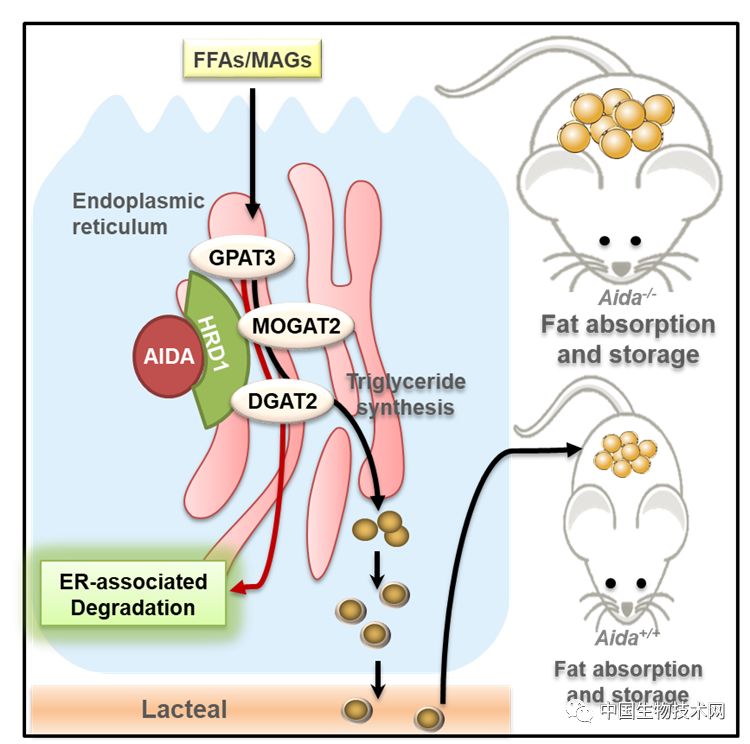 膳食脂肪进入体内后,首先在小肠里水解成脂肪酸和单酰甘油,被小肠上皮细胞摄入,在小肠上皮细胞中又重新合成脂肪,形成脂蛋白并从小肠上皮细胞分泌,而进入淋巴循环并通过血管输送到全身被各个器官利用或储存。而AIDA缺失小鼠中增高的脂肪吸收效率就来源于肠道中脂肪合成途径的数个合成酶的蛋白质水平的上调,促进脂肪酸重酯化减少细胞内的脂肪酸的含量,增加进一步从小肠里吸收脂肪酸。脂肪合成途径的代谢酶大多都定位于内质网。该团队通过机制的研究发现,AIDA缺失导致一种原先认为只调控内质网里的蛋白质质量和数量的途径——内质网降解途径(ERAD)无法降解这些脂肪合成酶,导致其蛋白水平上升。内质网降解途径的抑制剂处理的野生型小鼠的餐后血脂会上升到跟未处理的Aida敲除小鼠相同的水平,而该抑制剂对Aida敲除小鼠则没有作用,这表明Aida敲除和ERAD失效对于餐后血脂有完全一致的效果。在肠道特异性敲除Aida的小鼠中,肠细胞脂肪吸收的速率和血液中脂肪含量的上升速率等表型跟上述全身敲除小鼠非常类似,也表明了肠道中的AIDA在脂肪吸收效率的调控上至关重要。