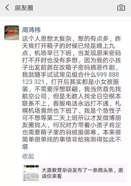 周鸿祎发微博表示,拿错的箱子和他的一模一样,他急急忙忙也没核对行李牌,拿着就走,坐了三小时车到酒店洗澡换衣服,打开箱子时候就发现密码不对。