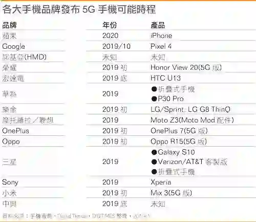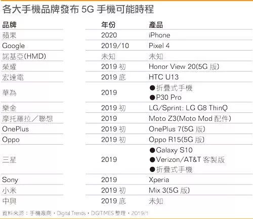 近日有媒体公布了一份5G手机发布时间表,从2019年初到2020年,排名前十的手机厂商的5G产品将会迎来密集发布。