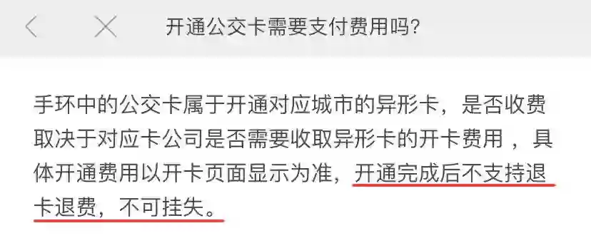 开卡时交付的 20 元服务费还需要你到地铁站办理退还。此外,如果你先前使用的是手环类的异形交通卡,则需要到对应的应用里查看相关条款,确定能否退还服务费。以小米手环为例,开卡后无法退还服务费。