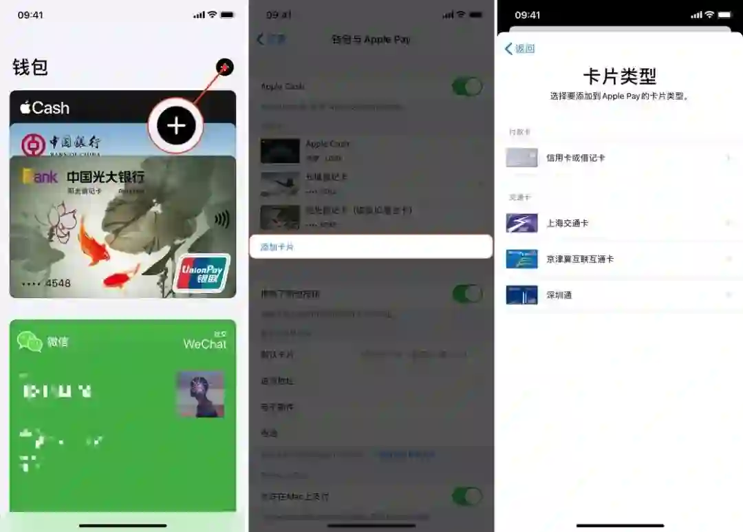在 Apple Pay 里开卡非常简单,只要点击右上角的「+」,或在「系统设置 - 钱包与 Apple Pay」里点击「添加卡片」,随后跟着系统提示一步步完成就行了。